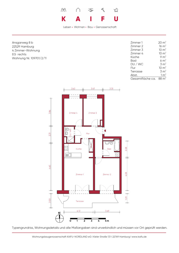 Die Wohnung befindet sich im Baufeld B1 (Ansgarweg 8a-c). In der Visualisierung handelt es sich um das Gelbklinker-Gebäude.